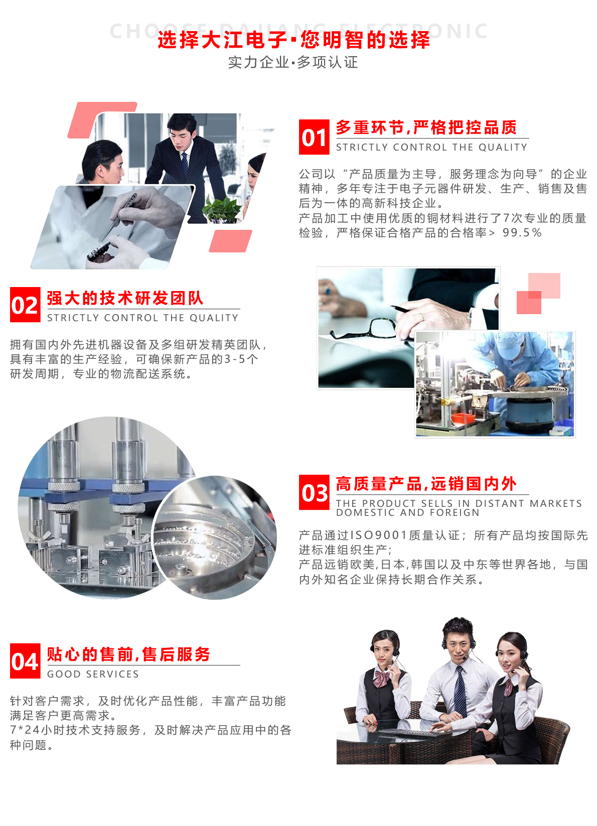 東莞市大江電子創(chuàng)立于2005年,一般納稅人企業(yè)可開13個(gè)點(diǎn)增值稅發(fā)票,位居?xùn)|莞市茶山鎮(zhèn)莞民投松湖信息產(chǎn)業(yè)園7棟7樓,因?yàn)閷W?,所以信賴!大江電子專業(yè)生產(chǎn)各類音頻,視頻,變壓器,手機(jī)以及電腦等產(chǎn)品接插件,連續(xù)端子,車床制品及設(shè)計(jì)制造各種五金,塑膠模具,DC插頭,電源插頭,耳機(jī)插頭,手機(jī)插頭,電腦插頭相關(guān)產(chǎn)品已遠(yuǎn)銷歐美,日本,韓國(guó)以及中東等世界各地!大江電子有19年設(shè)計(jì)研發(fā)制造經(jīng)驗(yàn),具有雄厚的枝術(shù)力量和生產(chǎn)實(shí)力,2008年全廠推行了ISO9001:2000質(zhì)量管理體系標(biāo)準(zhǔn),ISO14001:2004環(huán)境管理體系的國(guó)際認(rèn)證,與國(guó)際接軌