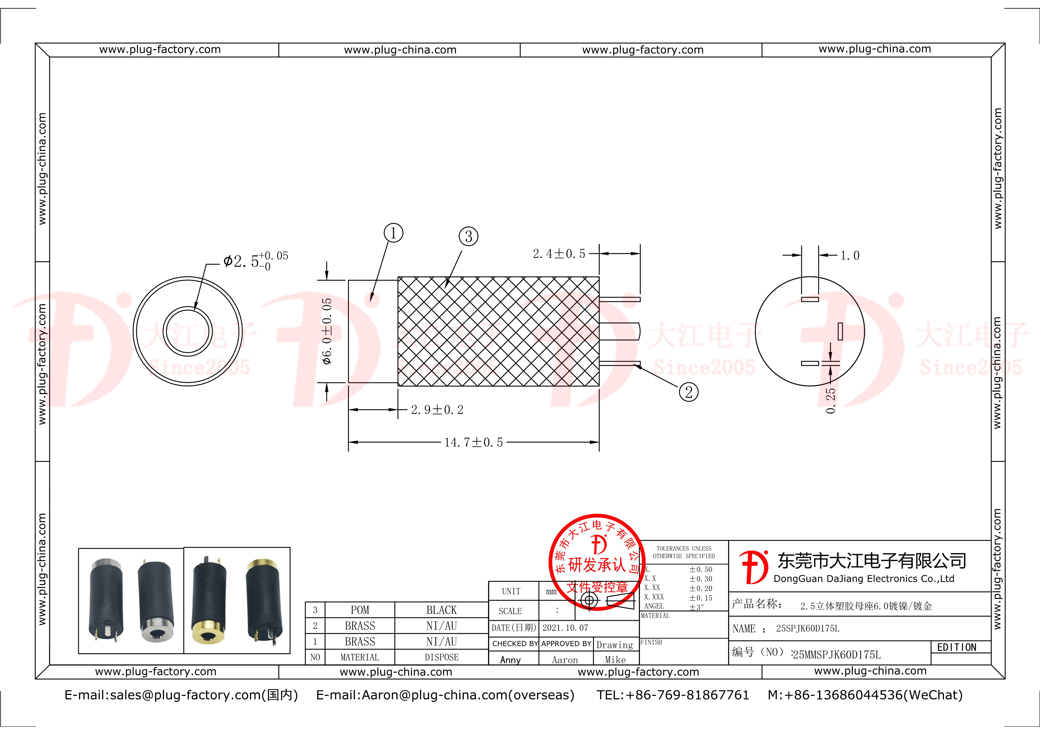 產(chǎn)品說明:2.5mm立體 6.0D 17.5L 塑膠 鍍金 耳機母座