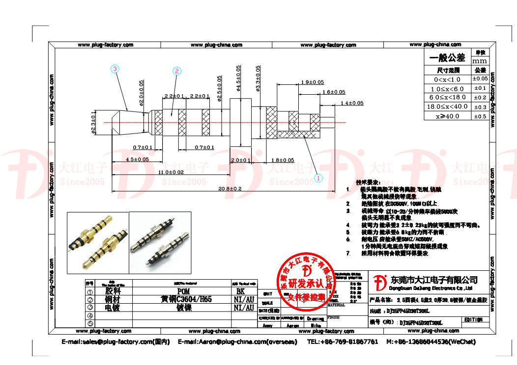 產(chǎn)品說明:2.5mm四級4.5盤-2.0厚20.8L 鍍金 耳機插頭