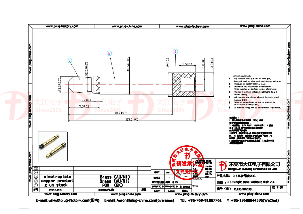 產品說明:耳機插頭-3.5單音無盤23.5L