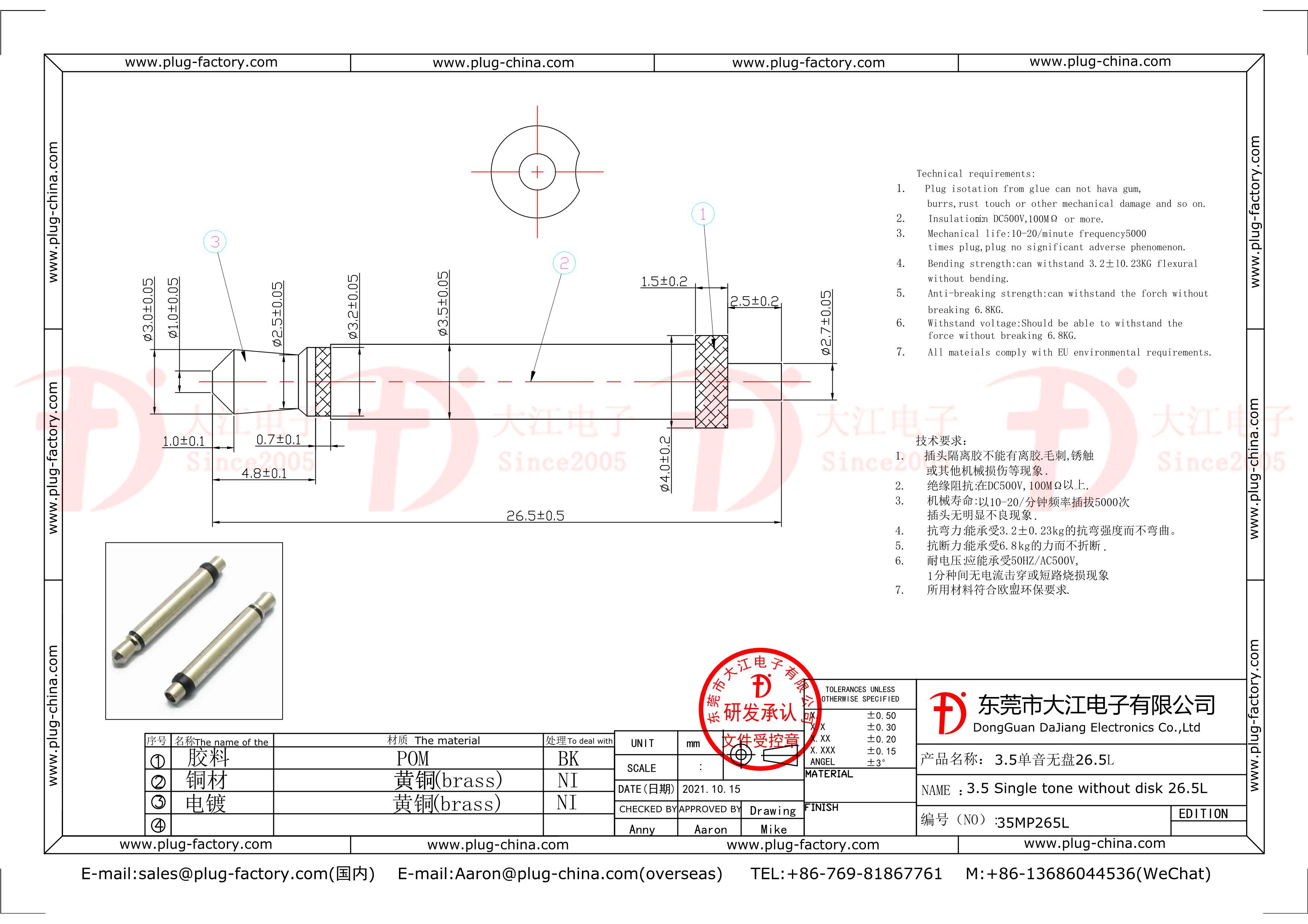 產品說明:耳機插頭3.5mm單音無盤26.5L低鉛加州65耐高溫大電流插頭