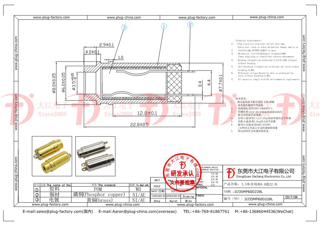 產(chǎn)品說明:耳機母座-3.5mm單音6.0D 22.8L 鍍鎳