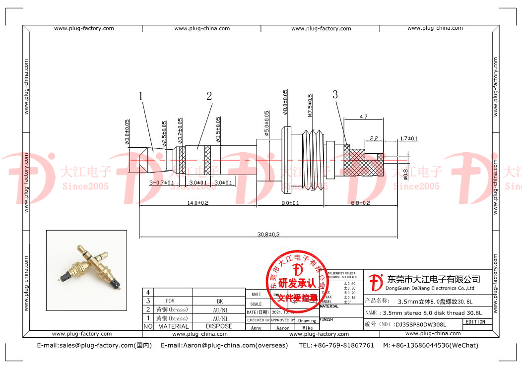 產(chǎn)品說明:3.5mm立體7.4-5.0雙盤30.8L鍍金帶螺紋 耳機插頭