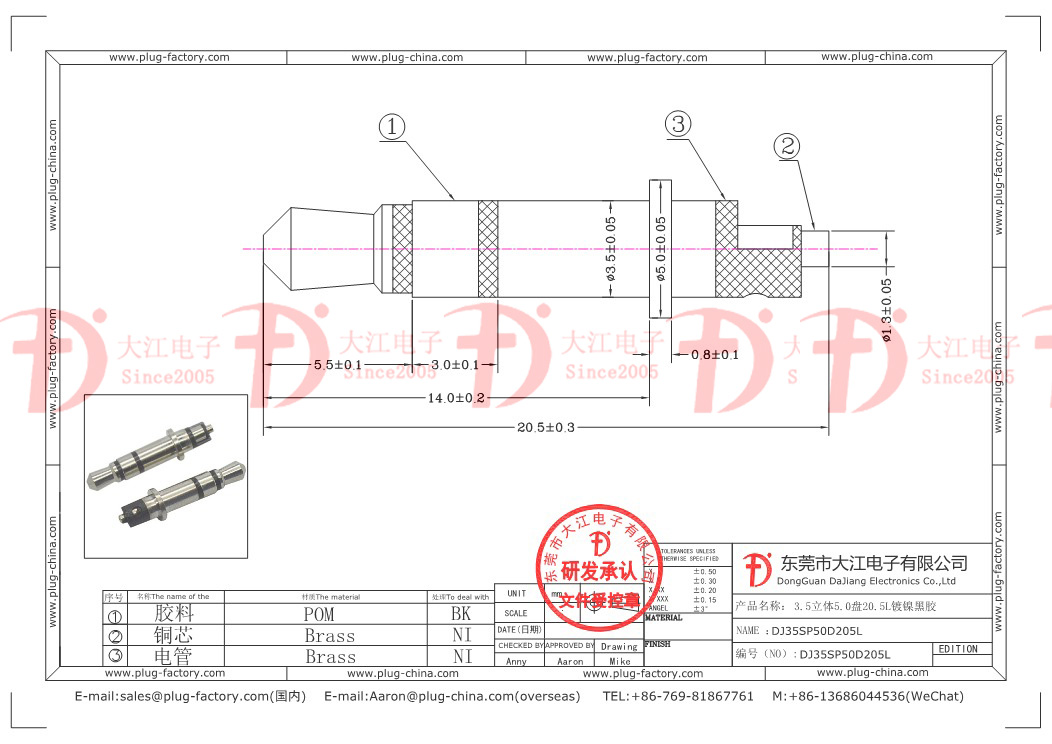 產品說明:耳機插頭 3.5mm立體5.0盤20.5L 鍍鎳