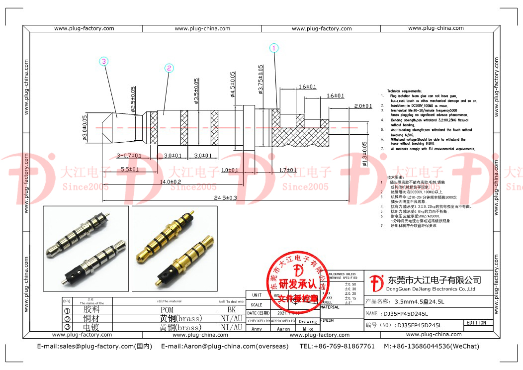 產(chǎn)品說明:耳機(jī)插頭-3.5mm四級(jí)4.5盤24.5L 鍍金