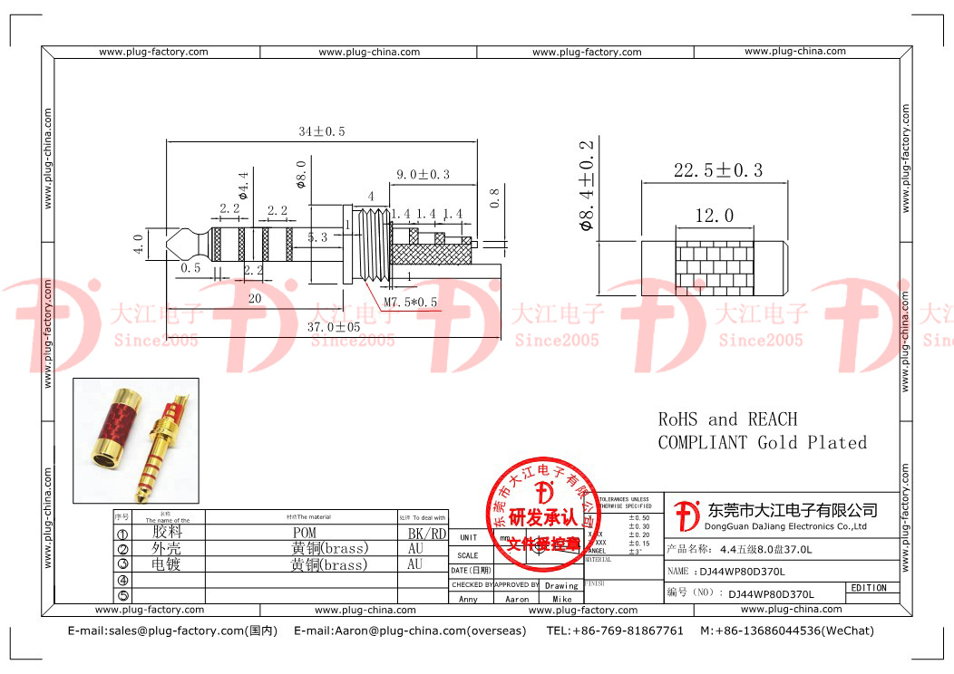 產(chǎn)品說明:麥克風(fēng)插頭-4.4五級(jí)8.0盤37.2L