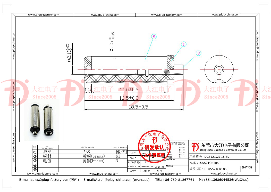 產品描述:OD=5.5mm,ID=2.1mm,L=18.5mm;黑膠及其它顏色,鍍層為鍍鎳.