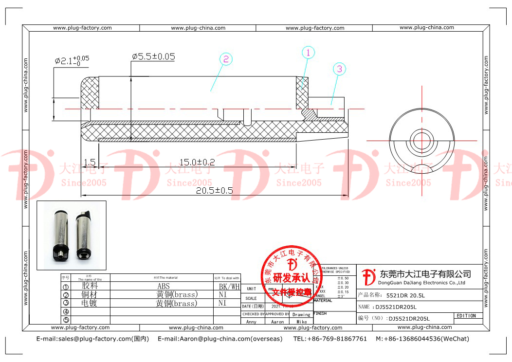 產品描述:OD=5.5mm,ID=2.1mm,L=20.5mm;黑膠及其它顏色,鍍層為鍍鎳.