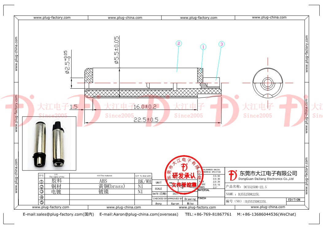 產(chǎn)品名稱:DC插頭-5525DR22.5L 黑膠