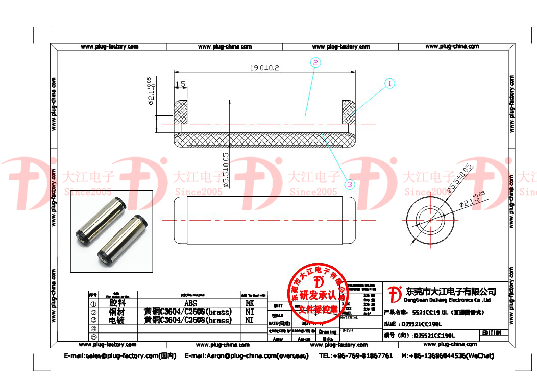 產品描述:OD=5.5mm,ID=2.1mm,L=19.0mm;黑膠及其它顏色,鍍層為鍍鎳.