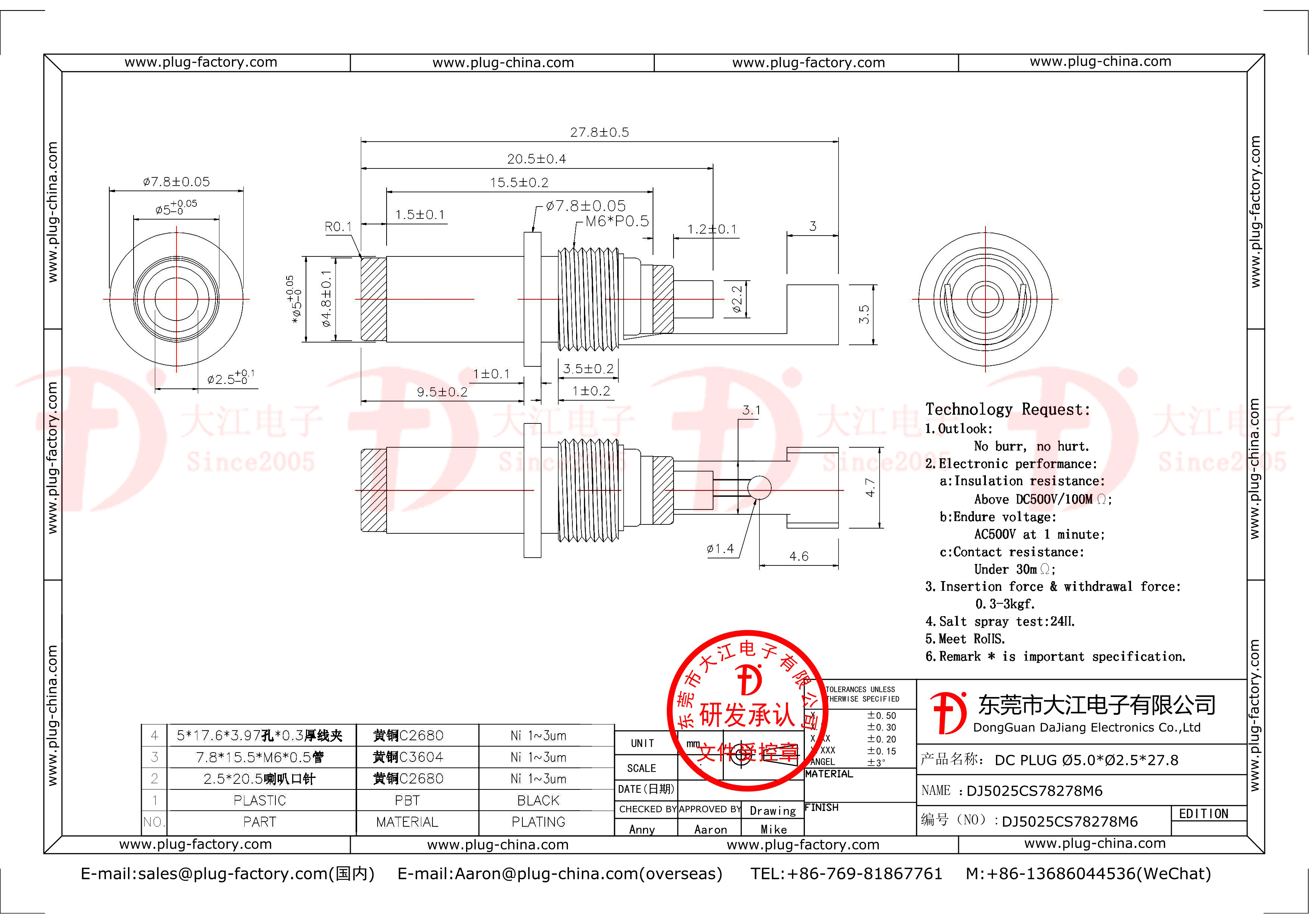 產品描述:OD=5.0mm,ID=2.5mm,L=27.8mm;黑膠及其它顏色,鍍層為鍍鎳.