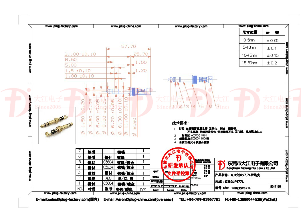 產品說明:6.35mm立體57.7L 鍍金帶牙帶線夾 麥克風插頭,安全插頭