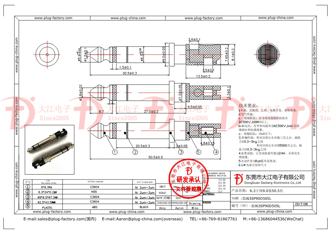 產品說明:音頻插頭6.35mm立體9.0盤51長低鉛加州65耐高溫