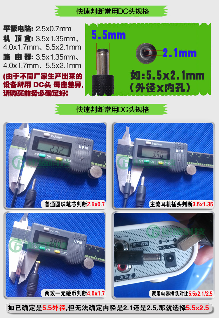 5.5*2.1(DC5521):目前使用最廣泛的DC圓頭接口。監控攝像頭、部分機頂盒、LED臺燈、數碼家電等等。。。大多使用12v1a 或 12v2a的功率輸出。