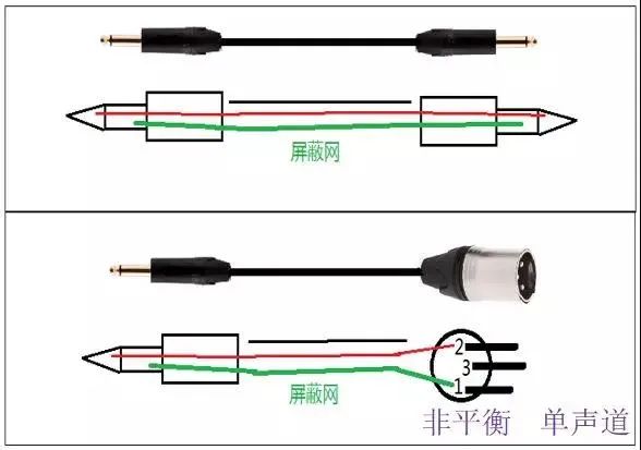 非平衡式連接和信號傳輸:采用兩端連接方式,信號線由內(nèi)部的一根芯線及屏蔽層組成,音頻信號的傳輸由芯線和屏蔽層負(fù)責(zé),芯線連接信號正極,而屏蔽層連接信號負(fù)極。用于非平衡式傳輸?shù)慕硬寮猩徎ú孱^和大二芯插頭兩種。