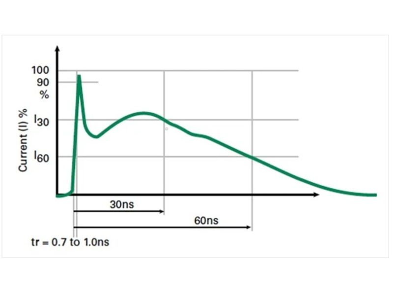 產品需要具有強大的防靜電能力,以獲得高可靠性。它們還必須符合IEC 61000-4-2等國際標準,才能在世界上所有地區(qū)進行銷售。圖2顯示了IEC 61000-4-2規(guī)定的靜電放電模擬測試波形,產品必須能夠通過CE認證。