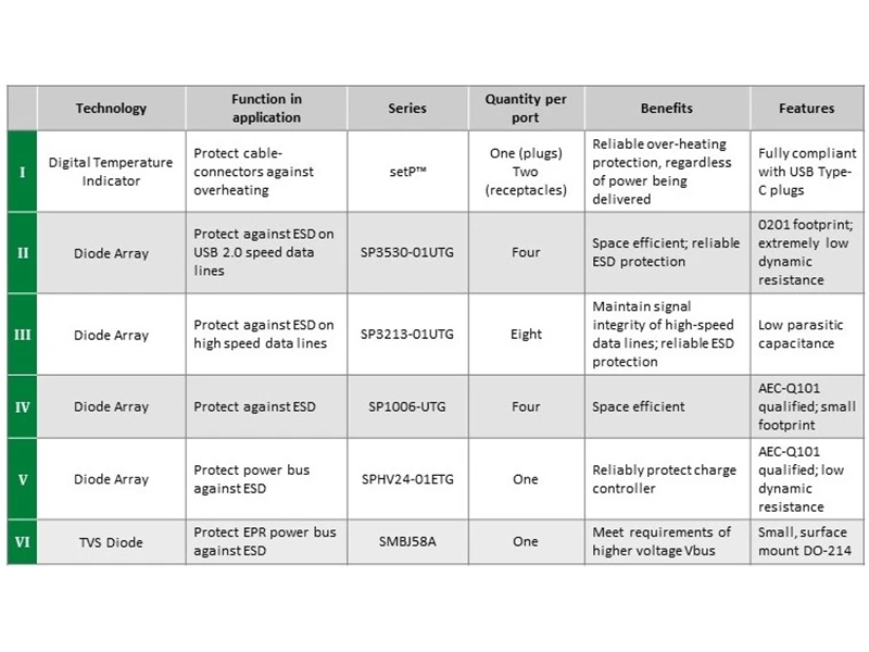 Vbus 線路要求 TVS 二極管能夠承受比信號線保護器件更高的功率水平。SPHV 系列 200 W TVS 二極管可保護容量為 100 W 的Vbus線路。SPHV 二極管可承受 30 kV 的 ESD 沖擊,并通過 AEC-Q101 認證,采用表面貼裝封裝。 對于擴展功率范圍接口,一個示例解決方案是 SMBJ 二極管。 它具有比 SPHV 二極管更高的 600 W 峰值額定功率,并且可以吸收高達 30 kV 的 ESD 沖擊。 與其它推薦用于 USB 端口的 TVS 二極管一樣,SMBJ 二極管是表面貼裝元件。