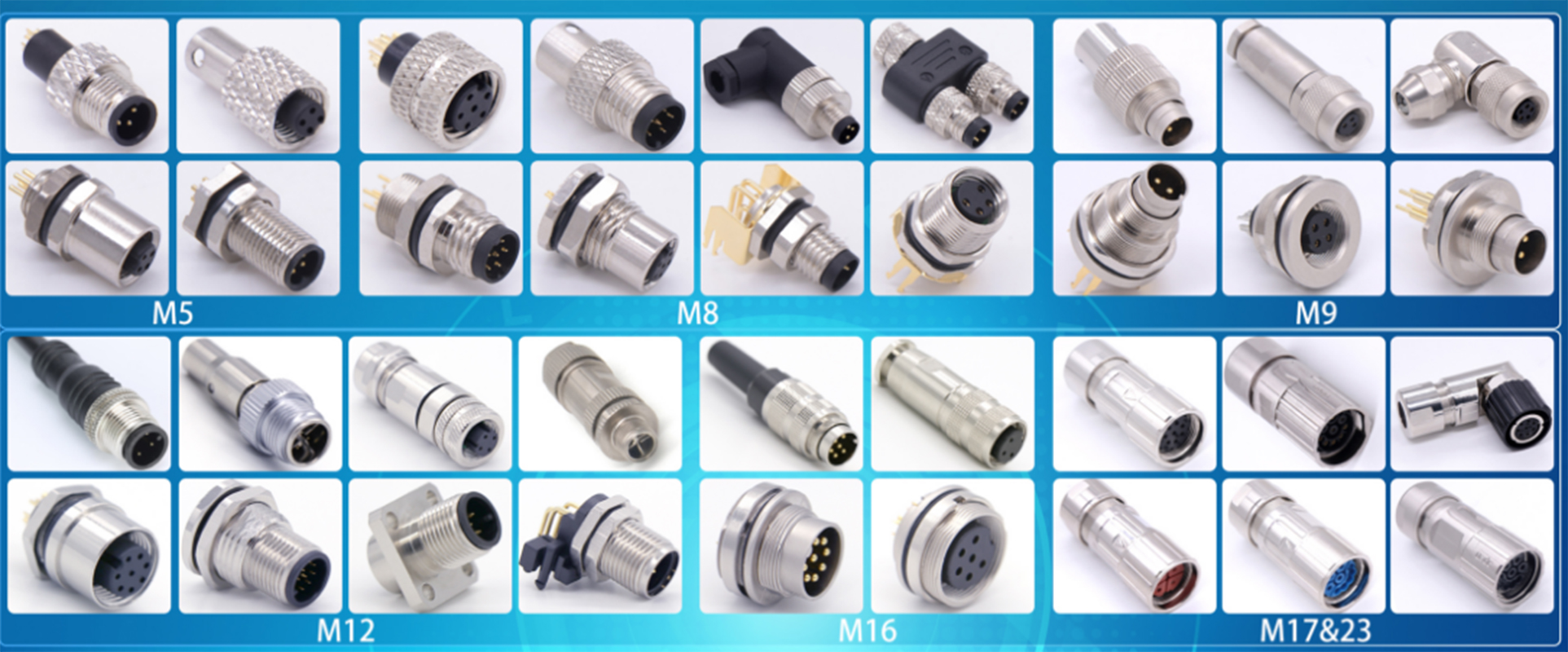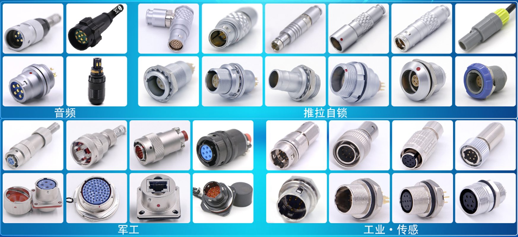 各類M5、M8、M9、M12、M16、M17、M23 連接器,推拉自鎖 B、K系列連接器,HR10、 HR25、SR30系列連接器,Y27、Y50、YL、TL 連接器,各類航空連接器(航空插頭)及其相應(yīng)的線纜組裝件。支持 OEM/ODM,滿足客戶特殊需求。