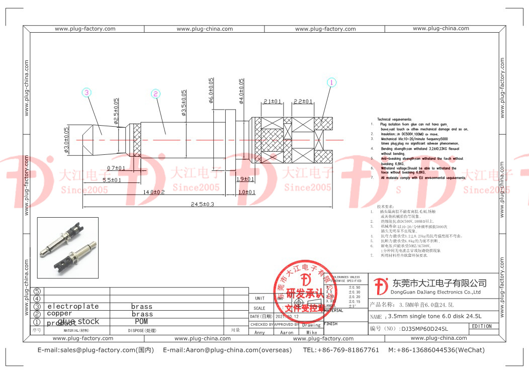 產品說明:耳機插頭-3.5單音6.0盤24.5L