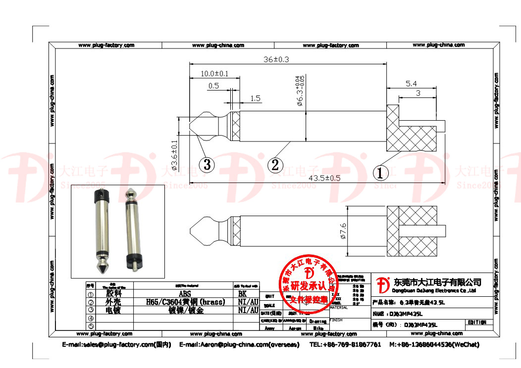 產品說明:麥克風插頭-6.3mm單音無盤 43.5L 鍍鎳