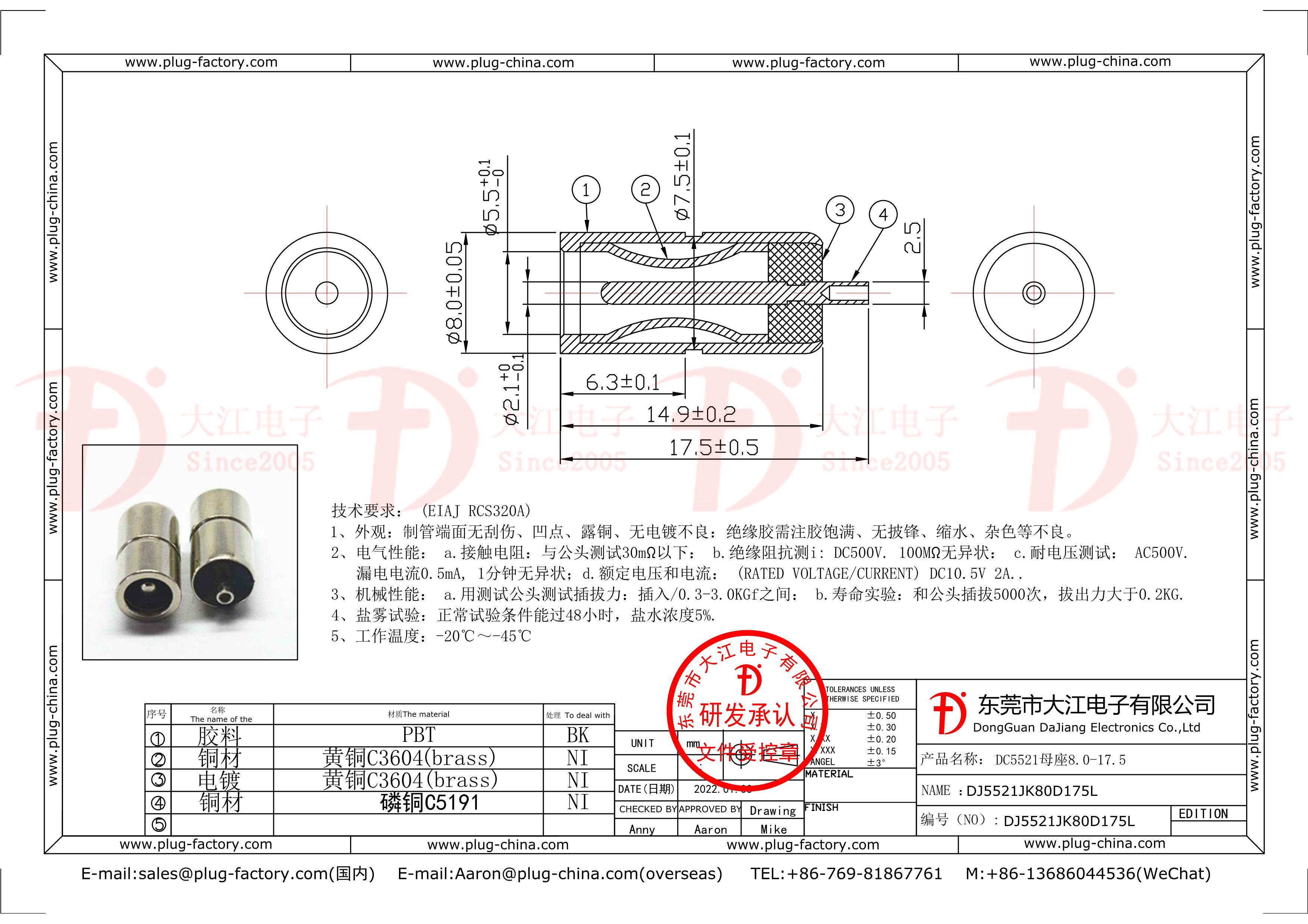 產品描述:OD=5.5mm,ID=2.1mm,L=17.5mm;黑膠及其它顏色,鍍層為鍍鎳.