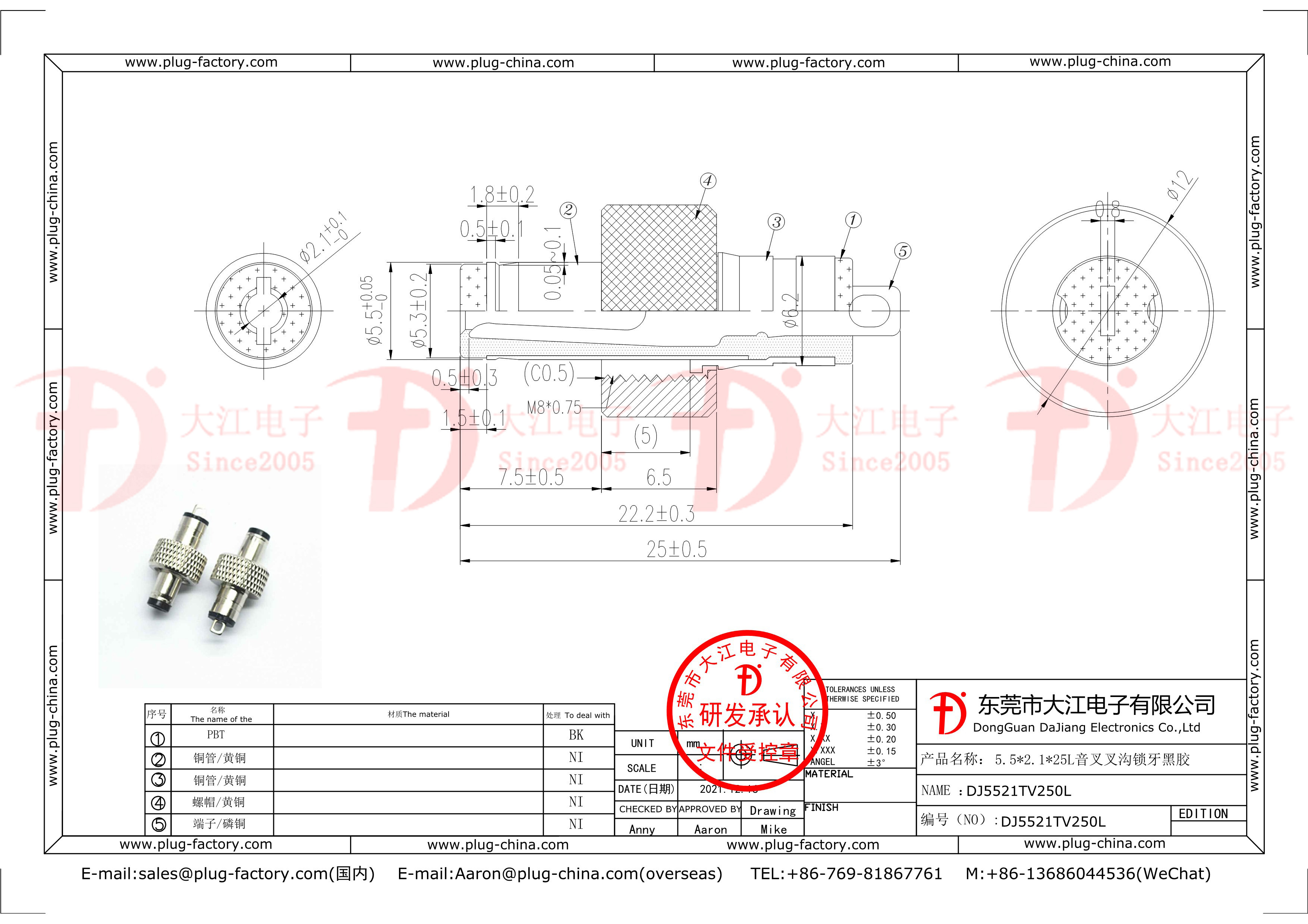 產品描述:OD=5.5mm,ID=2.1mm,L=25.0mm;黑膠及其它顏色,鍍層為鍍鎳.
